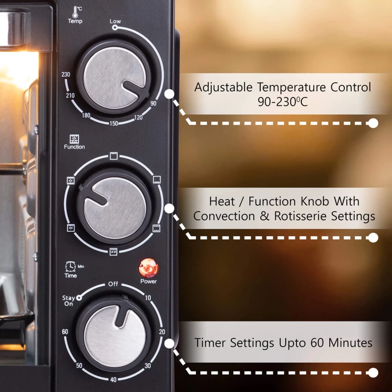 Whether you are baking cakes or grilling meat, the Agaro 30 L Oven-toaster-grill can help you do it all with ease. It can handle a variety of cooking tasks like baking, grilling, and skewering, thanks to its convection and motorised rotisserie modes. Additionally, this OTG allows you to customise the heat and cooking time with an adjustable temperature control and timing settings up to 60 minutes. Furthermore, this OTG offers optimal safety by automatically turning off when the cooking is done. And, even when it's hot, you can safely operate it with its cool-touch handle.