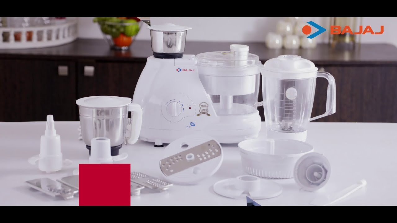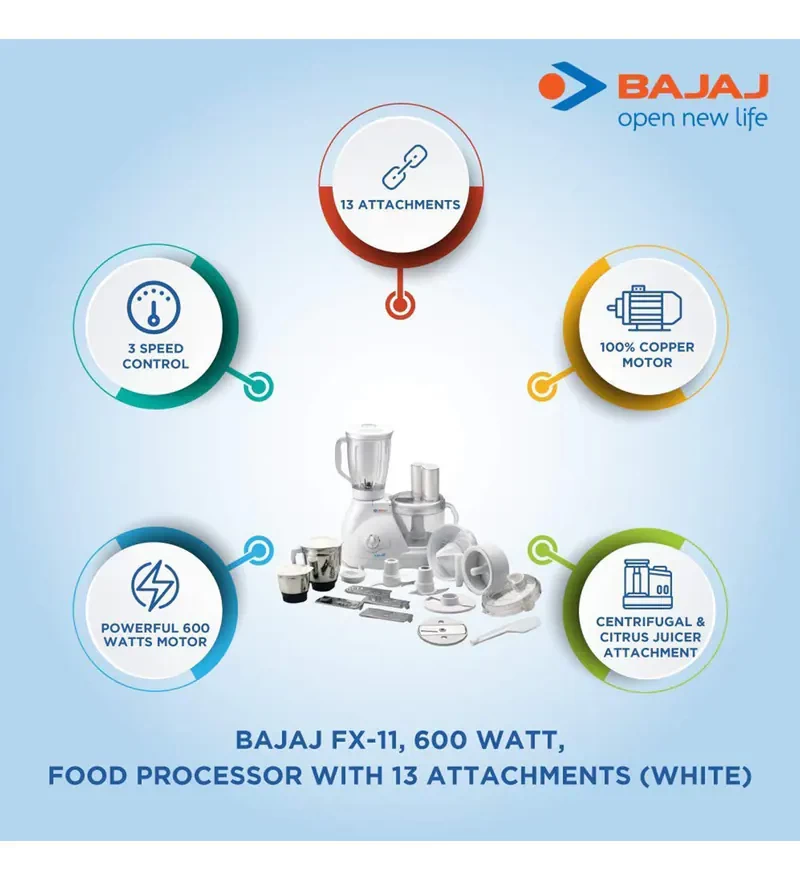 A versatile multifunction appliance, this Bajaj Fx11 Food Factory Food Processor can perform unimaginable tasks to make work simple for you. Body The solid design with smooth curves adds to the functional aesthetic of this stylish food processor. With certain parts being built out of polycarbonate material, this food processor comes with 3 jars - the liquidizing jar, the stainless steel grinding jar and the chutney jar also made of stainless steel. The many detachable blades bundled with this device are the dry grinding blade, the chopping blade, the slicing blade and the chutney blade, all made of stainless steel. In addition to these basic blades, it also comes with kneading, shredding, French fries and coconut scraping blades. The appliance is designed with a three-speed control for ease of use. Functions Apart from the standard functions of grinding, juicing and kneading, this versatile food processor also provides numerous additional functions such as kneading, scraping, chopping, shredding and slicing. Additional Features The appliance is made of an unbreakable polycarbonate processing bowl for better endurance. Power Consumption This food processor consumes a maximum of 600W of power to function efficiently.