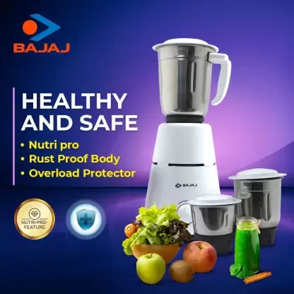 The Bajaj GX1 Mixer-grinder makes it easy to grind spices, purees, and other ingredients for your favourite recipes. It fulfils a variety of cooking requirements with its three jars of varying capacities. Additionally, the jars include easy-grip handles, adding to the convenience of use. This mixer-grinder functions within a voltage range of 220 to up to 240 V, safeguarding its motor from voltage fluctuations while ensuring effective performance. Furthermore, this mixer-grinder's overload protection safeguards this device from damage caused by motor overload.