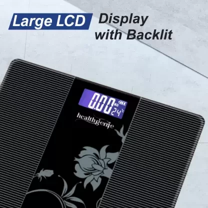 Healthgenie Electronic Digital Weighing Machine Bathroom Personal Weighing Scale - Max Weight : 180 Kgs. The design is symmetrical, anti-skid platform on jet toughened glass surface with curved edges for added safety.