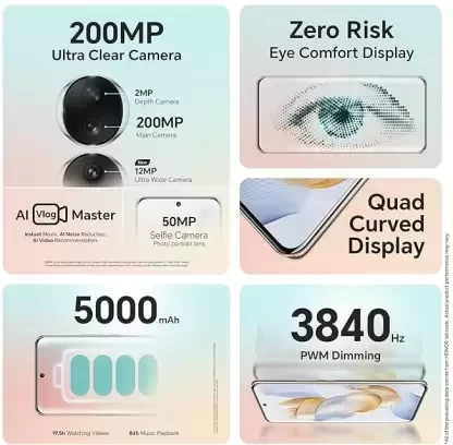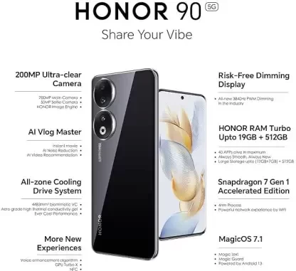 200MP Ultra-Clear Rear Camera, Master of Photography: HONOR 90 features a 200MP Ultra-Clear Main Camera with the largest 1/1.4-inch sensor in the segment, a 12MP Ultra Wide and Macro 2-in-1 Camera, and a 2MP Depth Camera and a 50MP Selfie camera and 100° wide FOV hardware to capture exquisite photos and videos. 120Hz Quad-Curved Floating AMOLED Display: The leading technology can correct the deform of images on the display, ensuring visual comfort. Equipped with a 6.7-inch/17.02cm quad-curved bezel-less display, HONOR 90 supports a high resolution of 2664x1200, 100% DCI-P3 color gamut, up to 1.07 billion colors, and segment leading peak HDR brightness of 1600 nits. Risk-free Industry's first 3840Hz PWM Dimming: To promote eye health the HONOR 90 is equipped with the industry-leading Pulse Width Modulation (PWM) Dimming of 3840Hz, the highest in the industry, which maintains a more comfortable and flicker-free viewing experience and minimizes eye strain especially in dimly lit environments. Extraordinary Performance: HONOR 90 is equipped with Qualcomm Snapdragon 7 Gen 1 Accelerated Edition 5G 4nm processor, which can provide exceptional performance and handle even the most intensive and demanding tasks with ease. The phone adopts a super-large arterial biomimetic VC with the Gen 3 high thermal conductivity graphite sheet and a full-scene AI intelligent thermal management system. Control temperature accurately, dissipate heat stably. Honor MagicOS 7.1: Powered by Android 13, Magic OS 7.1 is an all-scenario smart collaborative OS. With extensive Google services like Google Voice Assistant, Google Chrome, Google Maps, and more, Honor 90 blends the best of both worlds. Microsoft supports the "Link to Windows" feature, which allows Honor 90 users to connect their phone to the PC.