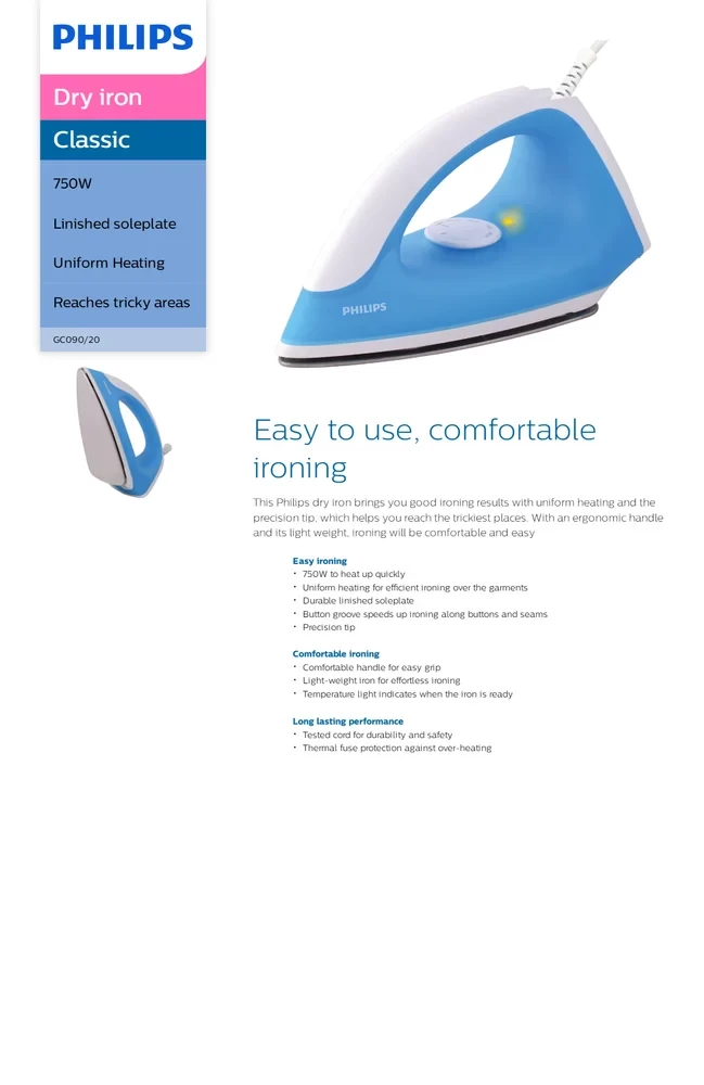 Ready-light indicator, Long lasting cord, Thermal fuse protection, 2 year world-wide warranty.