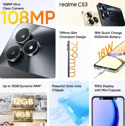 Enjoy a seamless experience with multitude of benefits on this realme C53 smartphone. Take stunning photoshoots with the 108 MP camera and take amazing photos in pixel mode and 3X zoom modes. Sporting a slim 7.99 mm display, you can have an amazing visual interaction with your phone with 90 Hz refresh rates. The powerful octa-core chipset available with this phone enhances your performance and productivity. Supported with up to 6 GB of RAM and 128 GB of ROM, your phone responds superfast and has massive storage capacity. Powered with a 5000 mAh battery and 18 W fast charger, this phone can be carried anywhere and can be used all day. You can stay updated with the number of steps, daily walking distance etc., with this mini capsule.