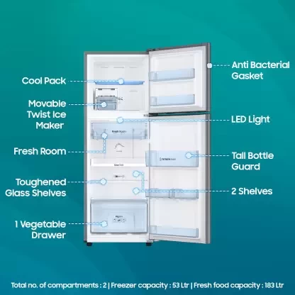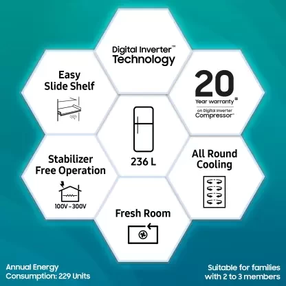 You can keep ample amounts of food and beverages fresh and hygienic in the Samsung Refrigerator. It uses Digital Inverter technology to deliver long-term, low-noise, and energy-efficient performance. Additionally, its Digital Inverter Compressor automatically changes speed to cater to your varying cooling needs. And, this refrigerator operates across a wide voltage range of 100 V to up to 300 V and is safeguarded against power fluctuations. Moreover, it functions reliably and consistently without the need for a stabiliser.