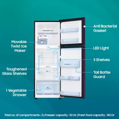 You can stock up on your weekly groceries and easily store them in the Samsung Refrigerator. Moreover, you can even store additional groceries and other food items in this refrigerator by converting the freezer into a fridge. With this refrigerator's Power Cool feature, you can cool groceries or drinks quickly with a simple touch. Also, it has a Power Freeze feature that allows you to freeze food or make ice with the touch of a button.